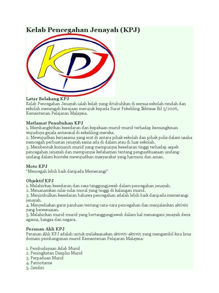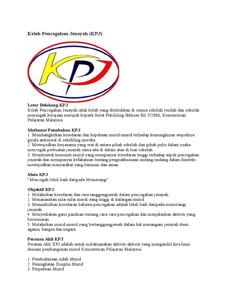 Matlamat Penubuhan KPJ 1. View flipping ebook version of KELAB PENCEGAHAN JENAYAH 1 published by g-88301797 on 2021-08-10. Kelab Pencegahan Jenayah ialah kelab yang ditubuhkan di semua sekolah rendah dan sekolah menengah kerajaan merujuk kepada Surat Pekeliling Ikhtisas Bil 52006 Kementerian Pelajaran Malaysia.