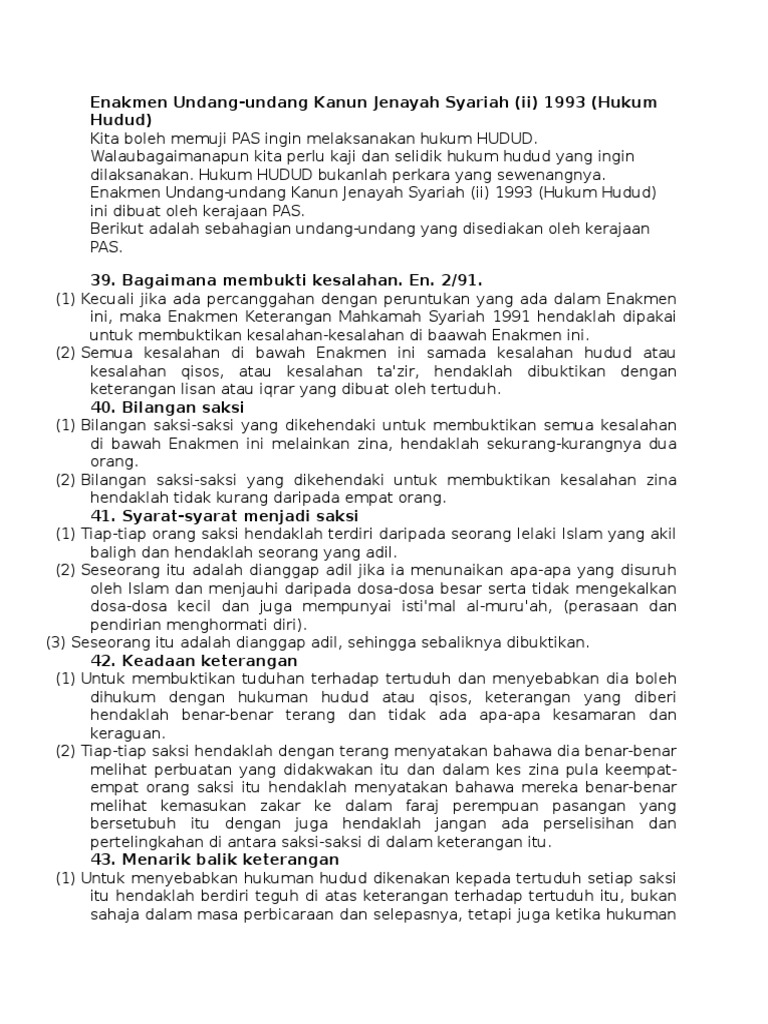 Ia bukan hudud tetapi isu pentadbiran untuk memperundangkan kesalahan jenayah syariah. Perbincangan tentang Rang Undang-undang Kanun Jenayah Syariah II Kelantan 1993 yang berkait dengan hudud qisas dan takzir serta permasalahan halangan dan peluang untuk melaksanakannya di Kelantan. Enakmen kesalahan jenayah syariah hudud dan qisas terengganu 1423h2002m Hudud bukan common law bukan untuk agama lain Bolehkah DNA menggantikan saksi dalam kes rogol untuk disabitkan dengan hudud.