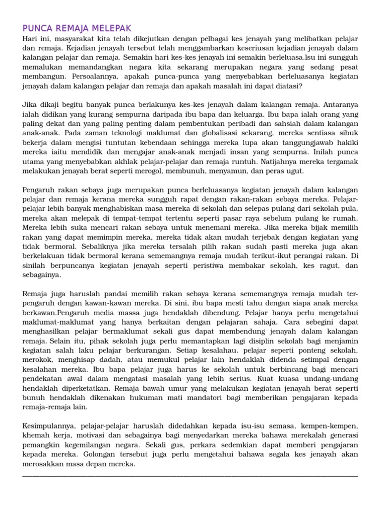 Rakan sebaya merupakan insan yang paling rapat dengan remaja. SRATEGI MENJAWAB KARANGAN ISU REMAJA Jika soalan berkenaan. JENAYAH INDEKS Nisbah jenayah indeks bagi 100000 penduduk Nisbah jenayah indeks bagi 100000 penduduk di Malaysia pada 2017 bertambah baik kepada 3097 berbanding 2016 3552.