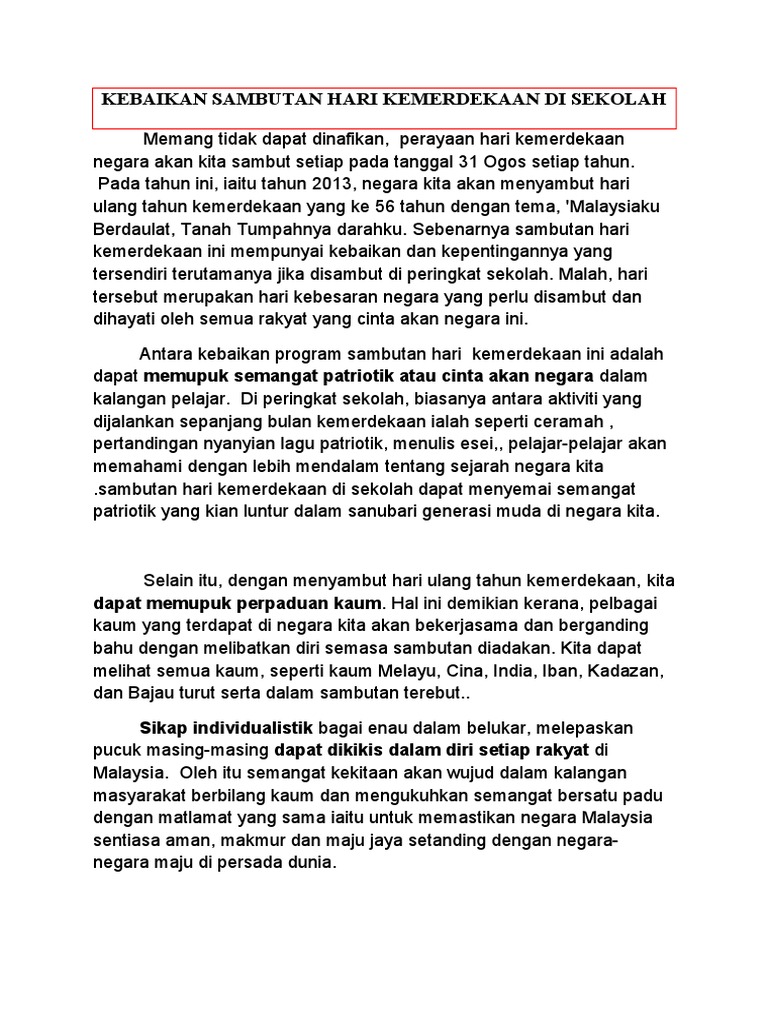 Contoh karangan sambutan hari kemerdekaan di sekolah saya contoh karangan. Sambutan hari kemerdekaan di sekolah saya karangan. Setiap tahun negara kita akan mengadakan sambutan hari kemerdekaan negara bagi mengingati detik bersejarah yang amat berharga kepada semua rakyat Malaysia.