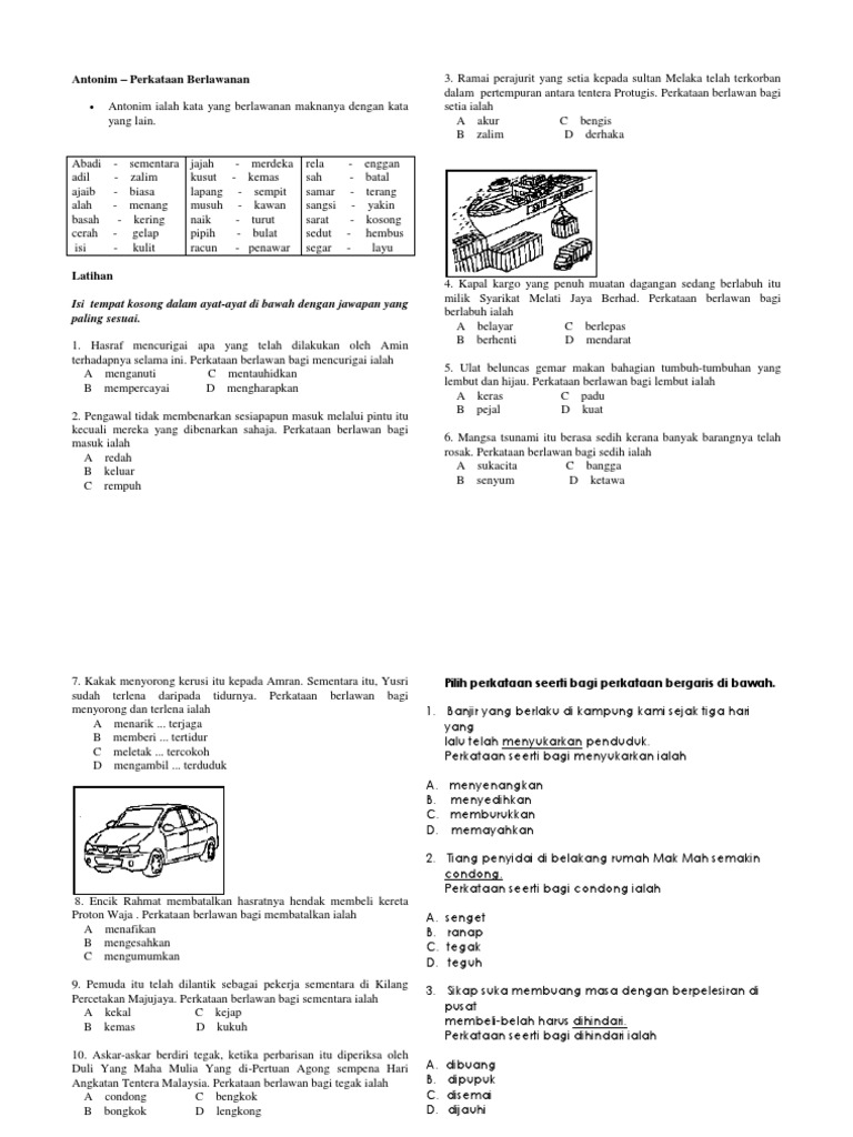 Antonim bagi condong ialah a tegak b belok c senget d sendeng 13 Abdullah Sani telah berhijrah ke New York dua tahun lalu. A membuang B mencampak C menanggal D menyangkut Eina menolak pelawaan rakan sekelasnya dengan beradab kerana masih kenyang makan nasi lemak. A kembang B cantik C mekar D subur 36 Pada hari tertentu semua ibu bapa dipelawa hadir ke sekolah.