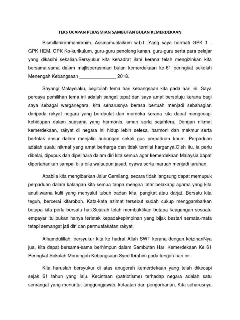 Teks Ucapan Perasmian Sambutan Bulan Kemerdekaan Pdf